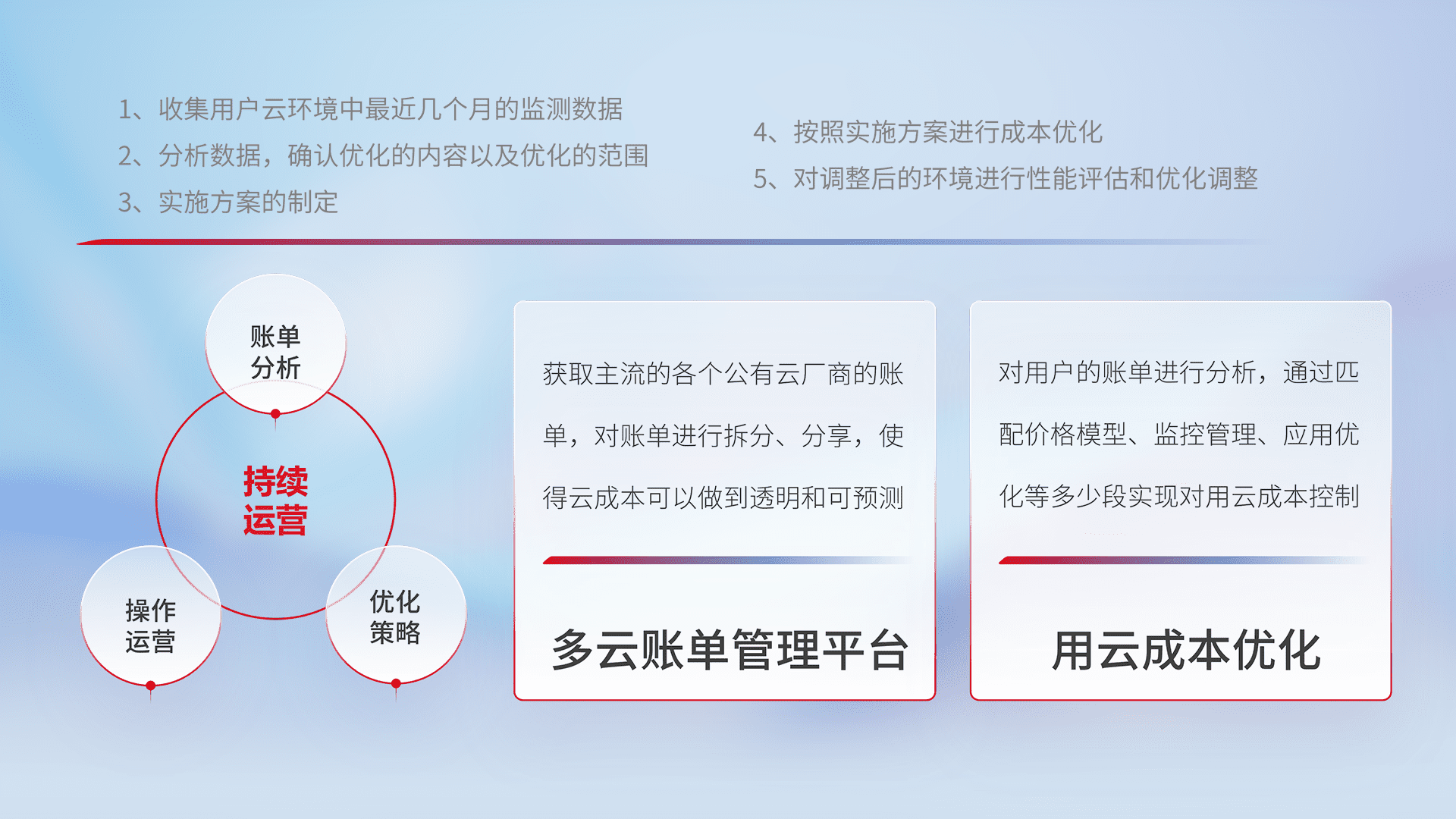 通过多云纳管,,以统一的资源数据模型把客户的云资源进行抽象和封装,,,,进而实现对多云资源的统一操作,,,,保障云资源管理的可靠性、、、稳定性与可用性。。。量身定制化运维内容,,,,配置、、开发运维、、补丁管理、、、、备份、、、、监控、、、认证和访问管理、、、审计和日常巡检等,,保障在用云过程中的可靠度,,,,稳定度以及高可用率。。。