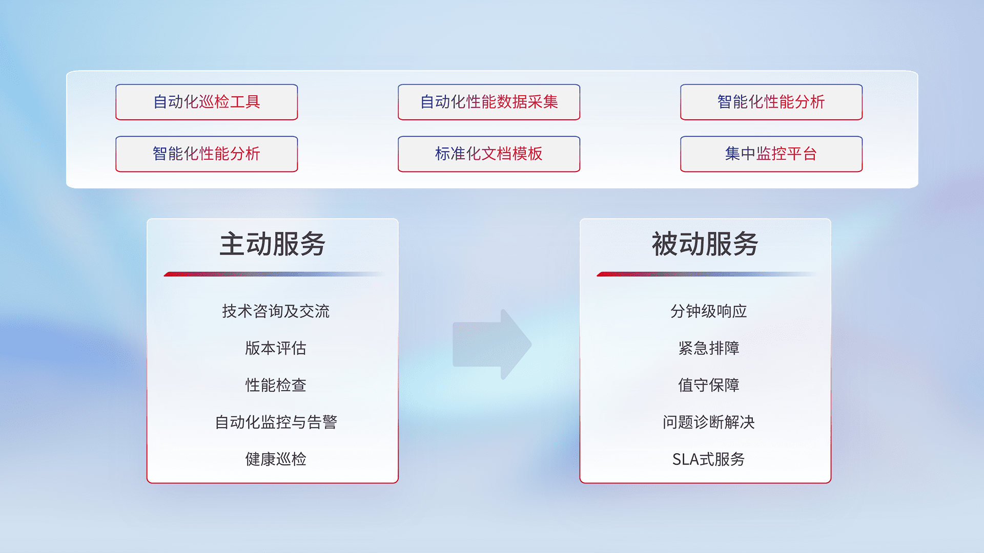 智能化工具和标准化文档,,保障服务质量,,提供主动服务(包含技术咨询、、、、版本评估、、、、性能检查、、自动化监控与告警、、健康巡检)和被动服务包含(分钟级响应、、、紧急排障、、、、值守保障、、、、问题诊断解决、、SLA服务)。。